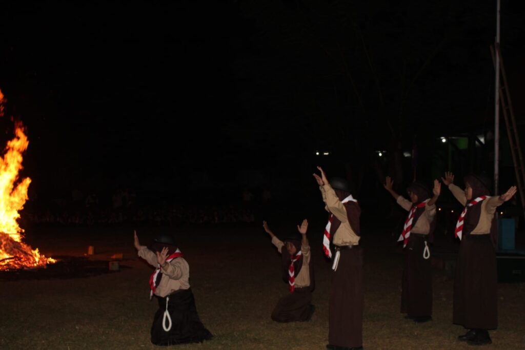 Upacara api unggun pun terlaksana sesuai dengan yang direncanakan dan dalam upacara tersebut juga terdapat beberapa rangkaian didalamnya seperti pembacaan dasadarma pramuka, pengambilan api suci dari pembina upacara (Ibu Laely Mardhiyani, S.Pd.) Serta pertunjukan pentas seni oleh seluaruh peserta secara berkelompok. Dan semua peserta pun sangat senang dalam kegiatan tersebut, dan secara bergiliran melaksanakan pentas seni. Pensi yang dilakukan di depan api unggun adalah kesempatan bagi peserta untuk menunjukkan bakat mereka dan menikmati hasil latihan mereka sebelumnya. Suasana hangat dari api unggun, ditambah dengan penampilan yang meriah, menciptakan pengalaman yang tak terlupakan bagi semua peserta. Setelah seharian beraktivitas, tidak terasa kegiatan telah berjalan sebagian dan saatnya untuk tidur yang dimana waktu tidur adalah momen penting bagi peserta untuk beristirahat dan memulihkan tenaga.